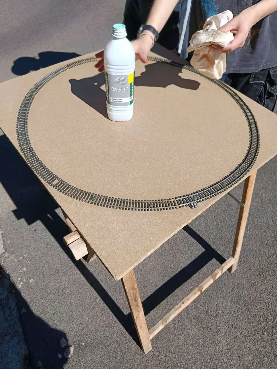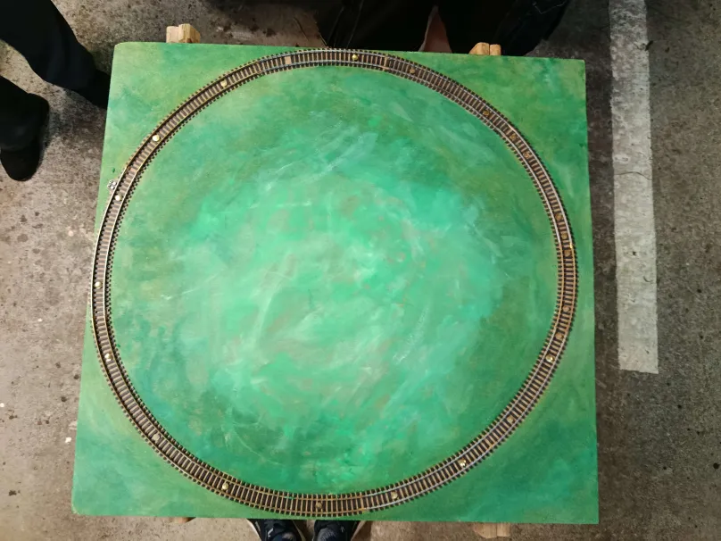 Au final, nous nous en sommes sorti avec une planche de 70*70cm ; en étant très laxiste sur la sécurité des miniatures qui frôlent le vide en permanence ! Une situation que nous acceptons pour les conférences (où les locos tourneront à très faible vitesse et sous supervision constante, ET avec des locomotives dans un état moyen), mais qui ne le serait pas pour une table de jeu quotidienne.