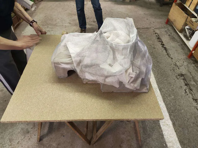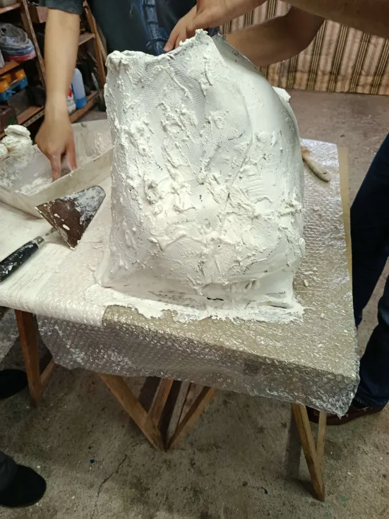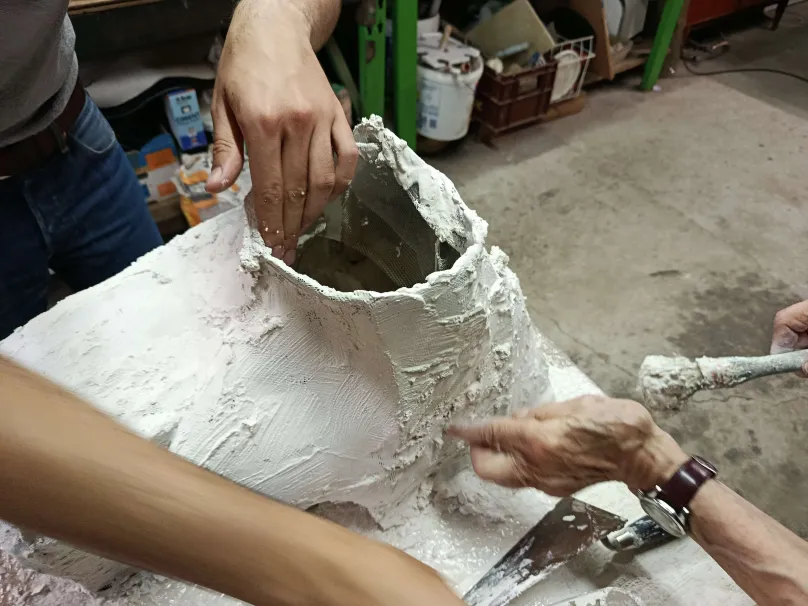 Maintenant, il ne nous reste qu’à faire notre plâtre, qu’on va appliquer au pinceau (et un peu à la main…) sur la structure pour lui donner une texture et une réelle ossature.