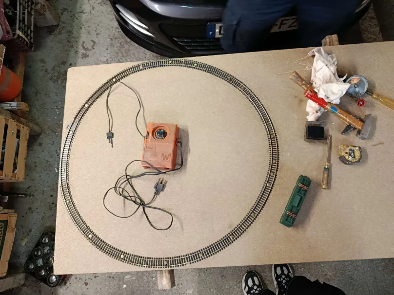 Nous avons ensuite pris des rails que nous avions à disposition, et avons tenté de faire le cercle le plus petit possible, sans abîmer les rails. Une attention toute particulière doit être portée sur le contact des rails entre eux : si le cercle formé par le rail extérieur est espacé à cause d’un angle trop grand, le courant ne passe plus et la locomotive s’arrête. C’est donc un juste milieu à trouver entre un angle raide qui permet d’utiliser une très petite empreinte au sol, et un angle large qui assure le bon contact électrique le long du rail.