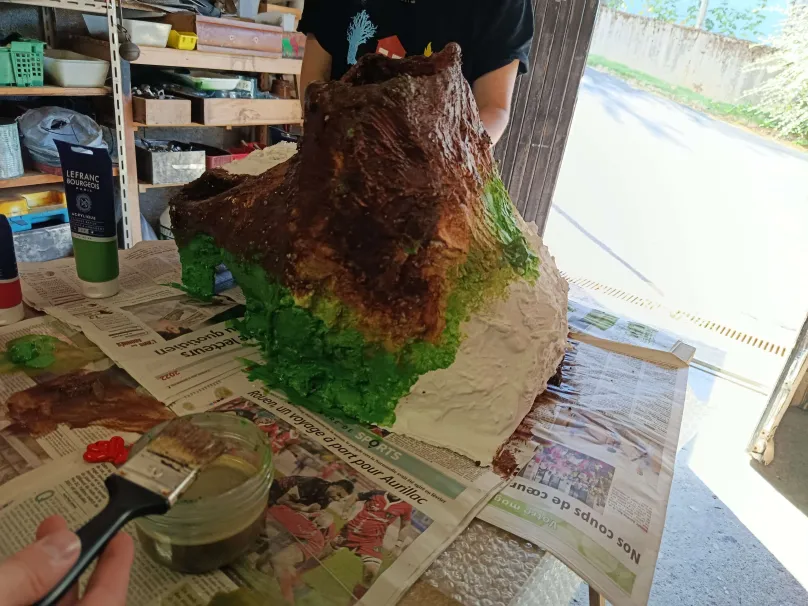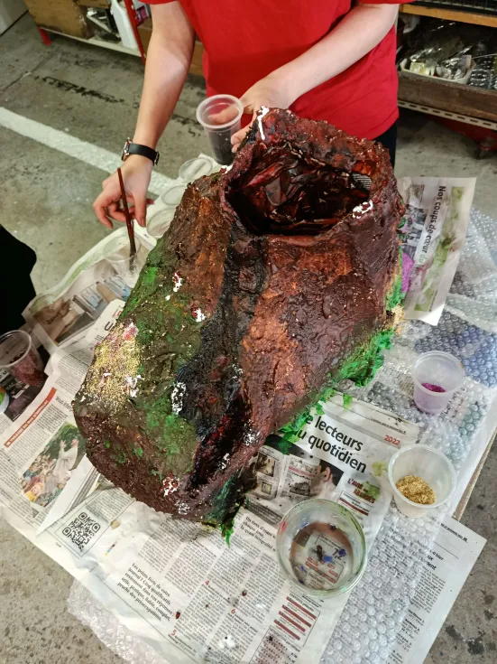 Le troisième jour est sous le signe de la peinture et du flocage ! Notre volcan étant totalement sec, il est désormais temps de lui donner une jolie texture et des reliefs. Pour cela, nous allons utiliser de la peinture marron, verte et noire afin d’effectuer des dégradés.