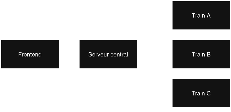 - Un serveur "central" fait le lien entre un frontend et les trains